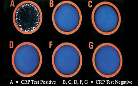 - برای بررسی آگلوتیناسیون، اسلاید زیر نور چراغ قوه بررسی کنید. در صورت وجود CRP بالا آگلوتیناسیون مشاهده می شود.
